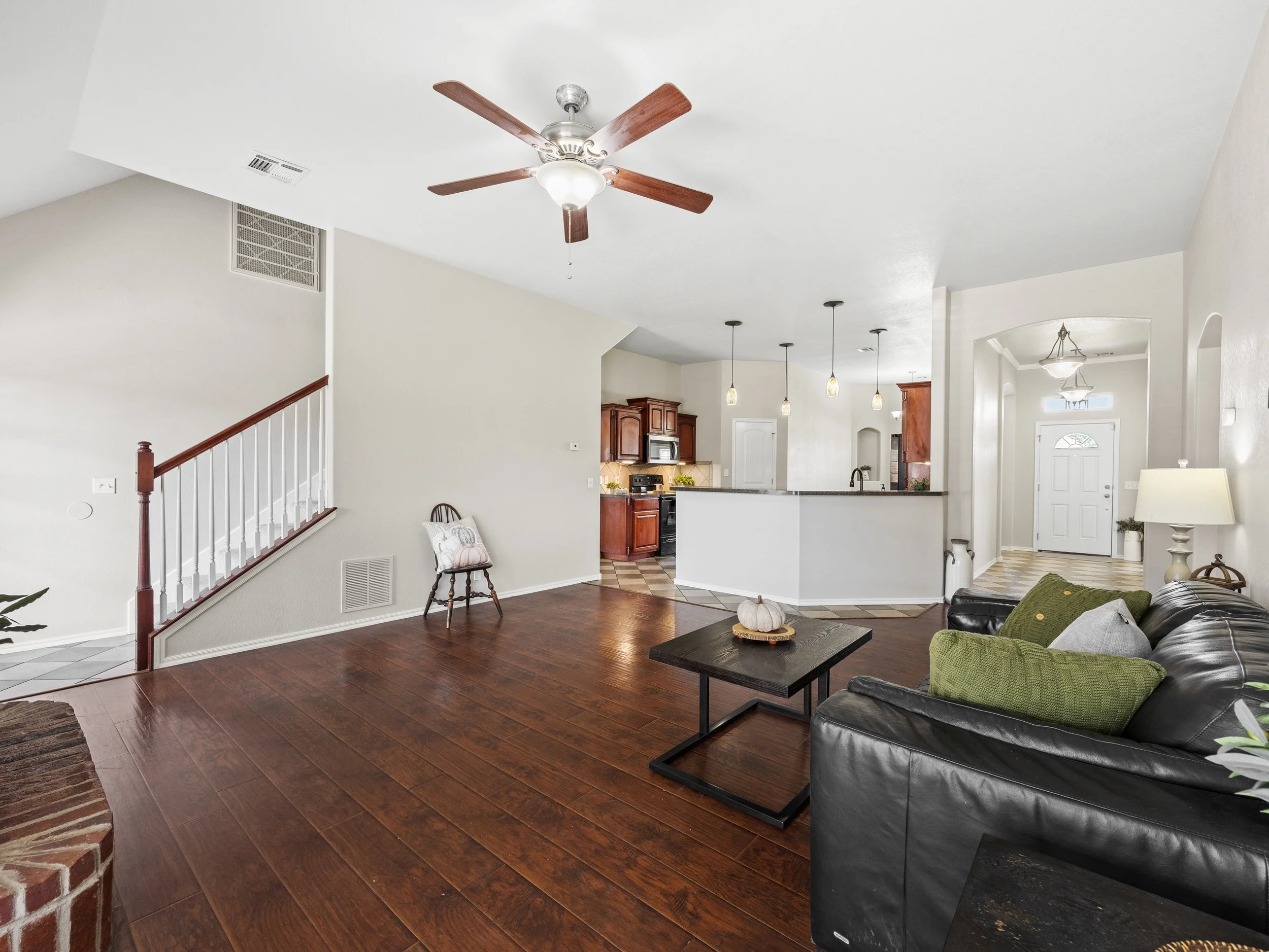 Spacious living room with hardwood floors, green and gray pillows on a black leather sofa, a wooden coffee table with a pumpkin decoration, and a ceiling fan. The background shows an open kitchen with pendant lights, wooden cabinets, and white walls.