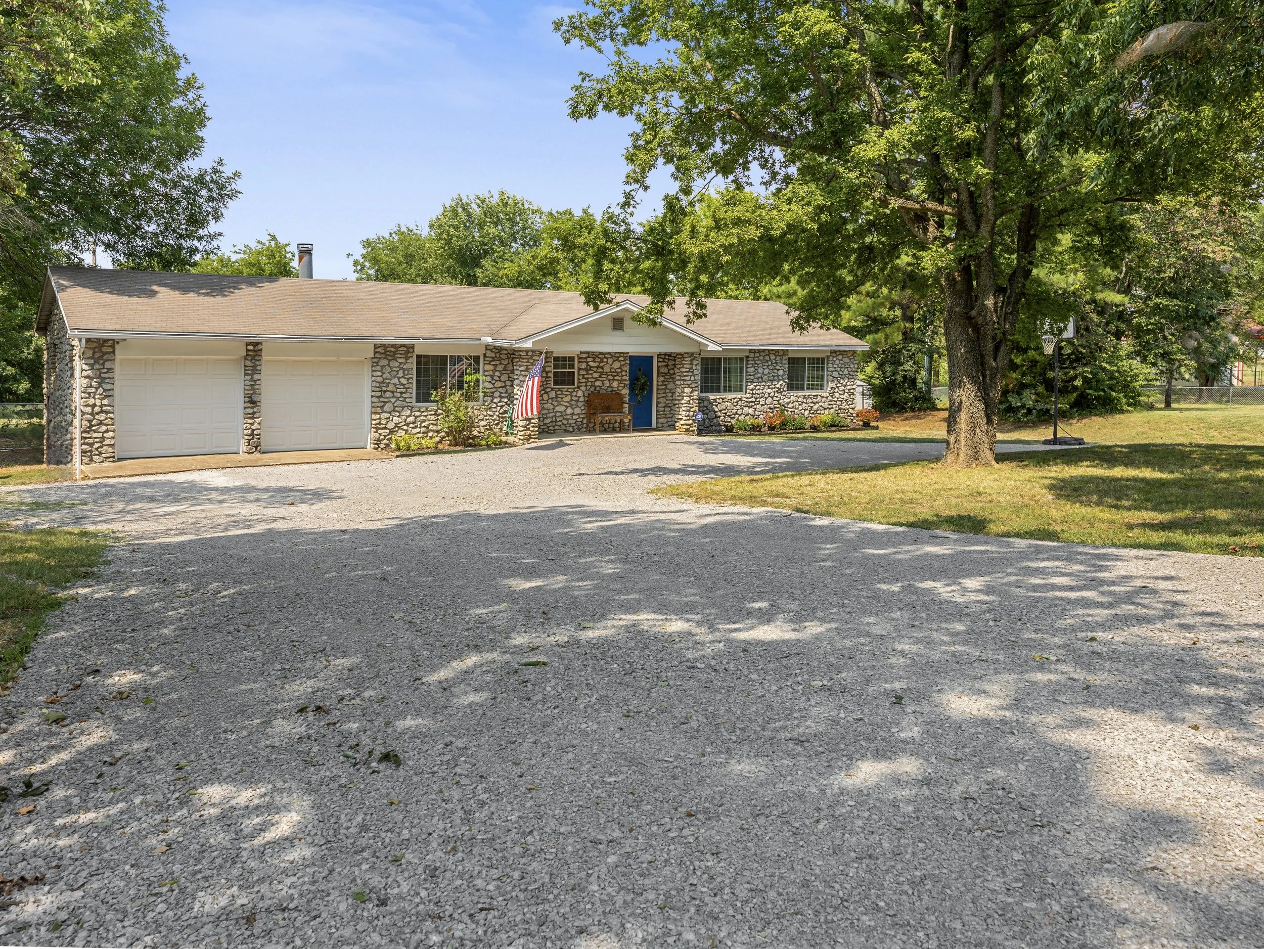 A single-story house with a stone exterior and a blue front door, surrounded by trees and a gravel driveway.