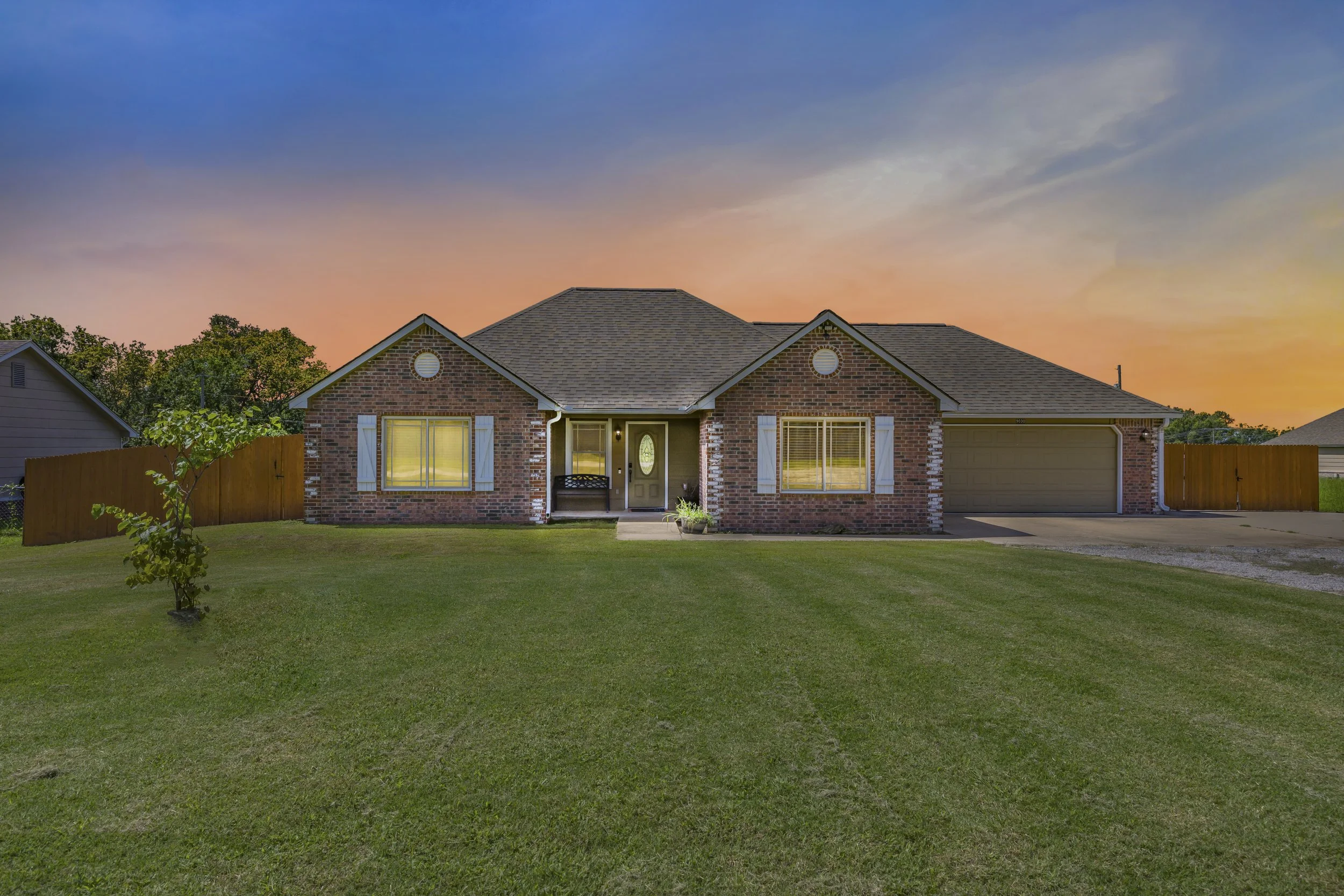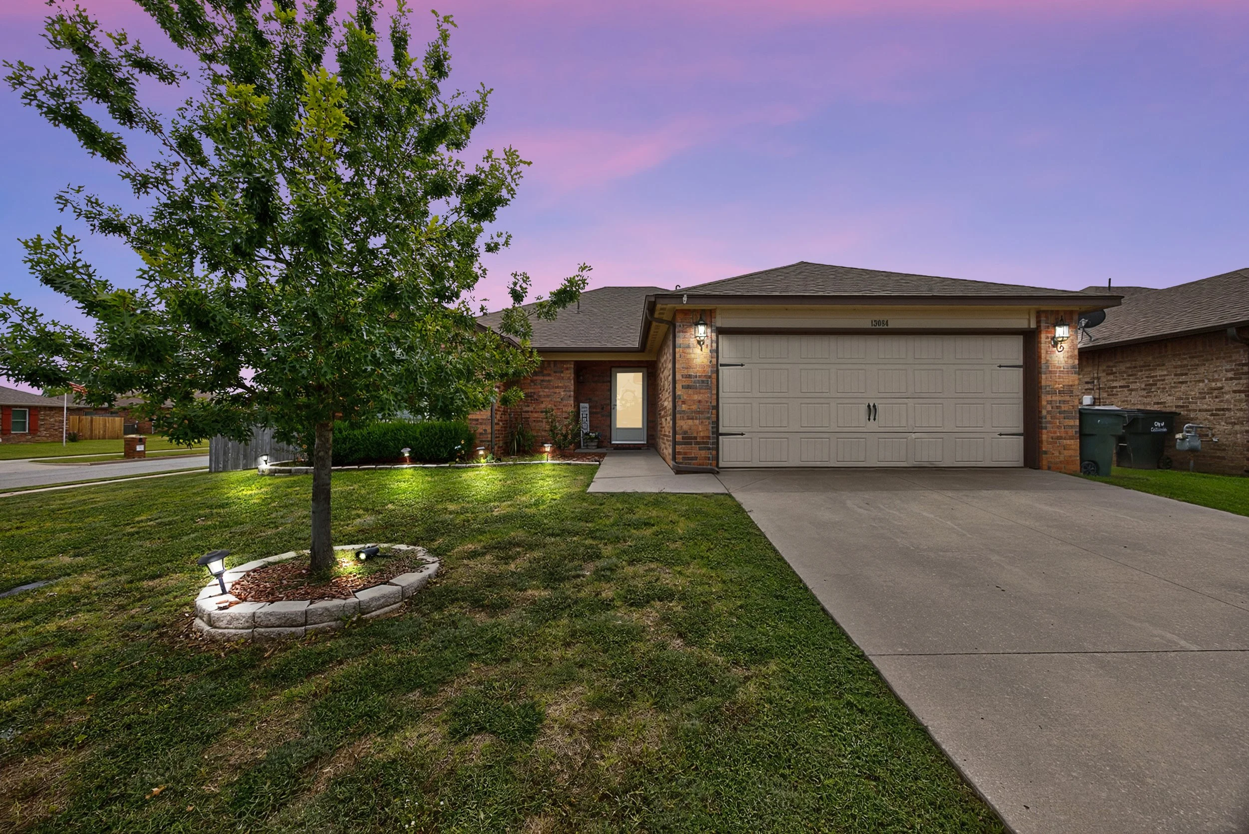 A single-story brick house with a two-car garage, a tree in the front yard, and a driveway at dusk with pink and purple sky in the background.