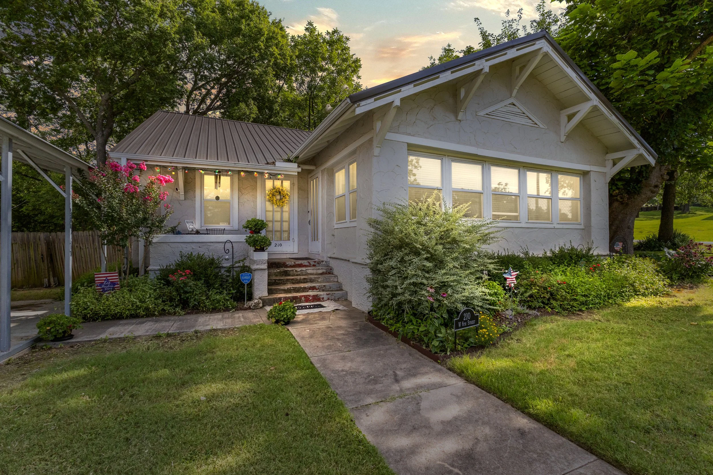 A white suburban house with a flower garden, small front porch, and American flags, set against a background of green trees and a sunset sky.