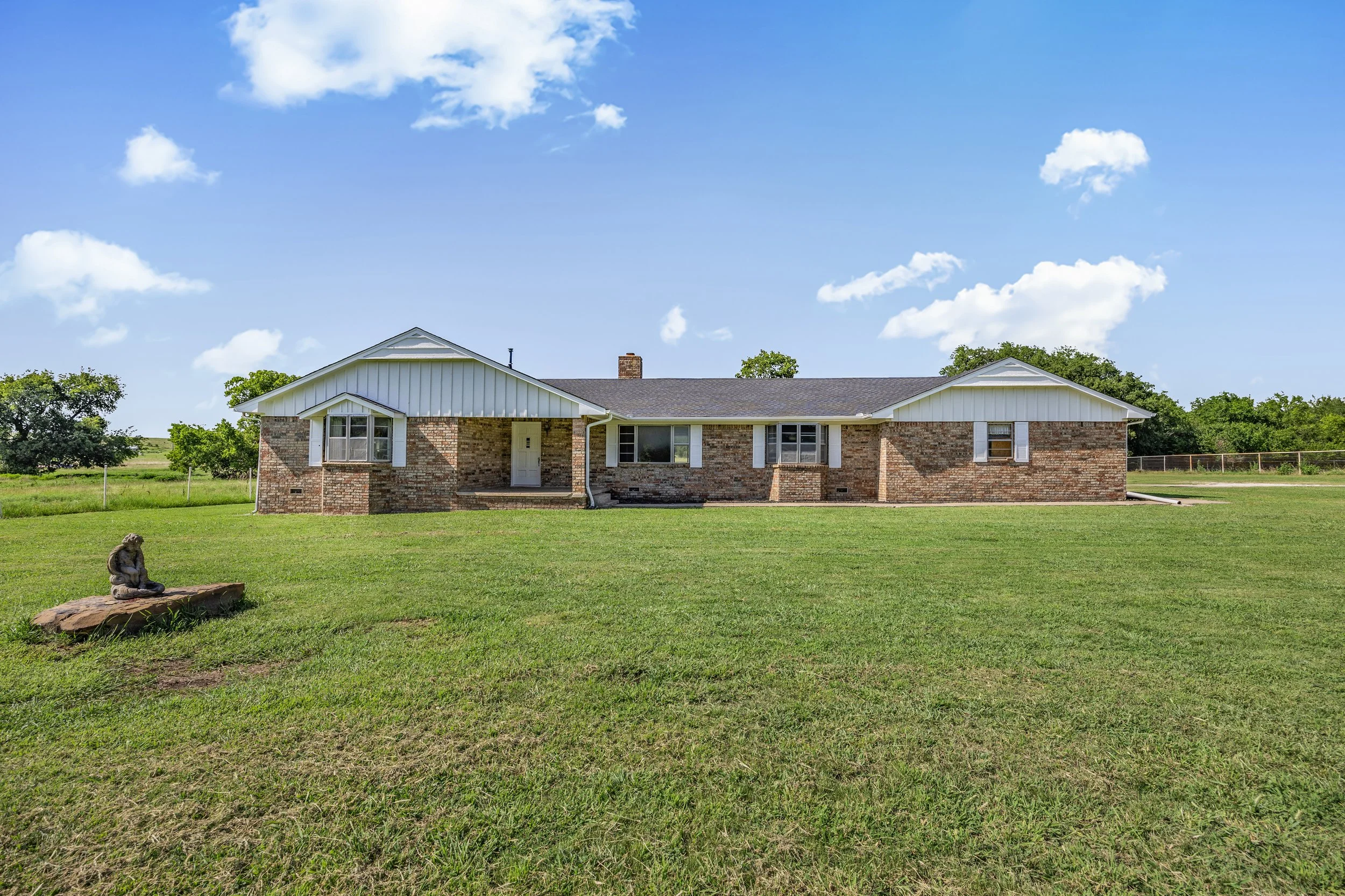 Single-story brick house with white siding on a grassy field under a blue sky with a few clouds.