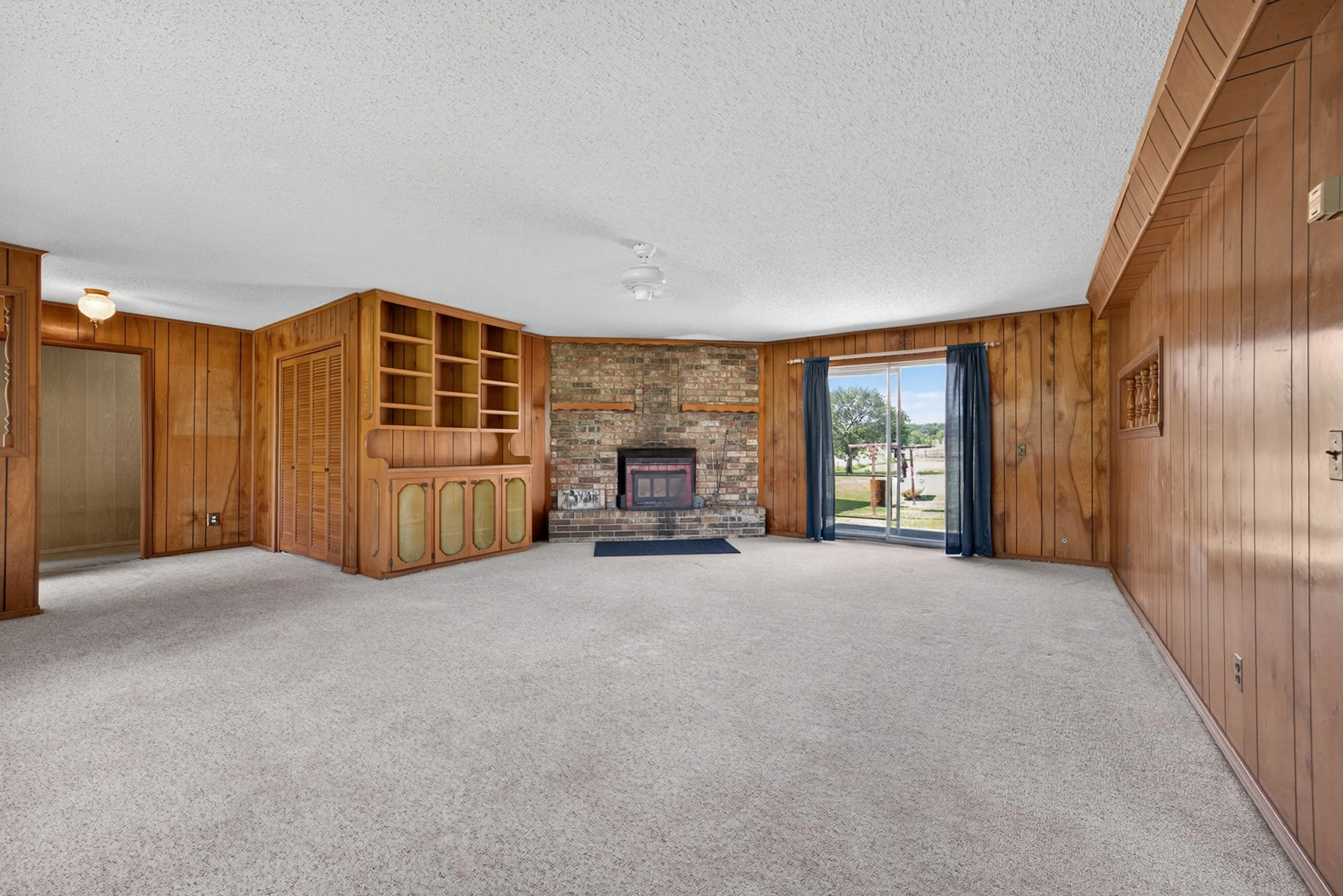 Empty living room with wood-paneled walls, brick fireplace, sliding glass door with blue curtains, and beige carpet.