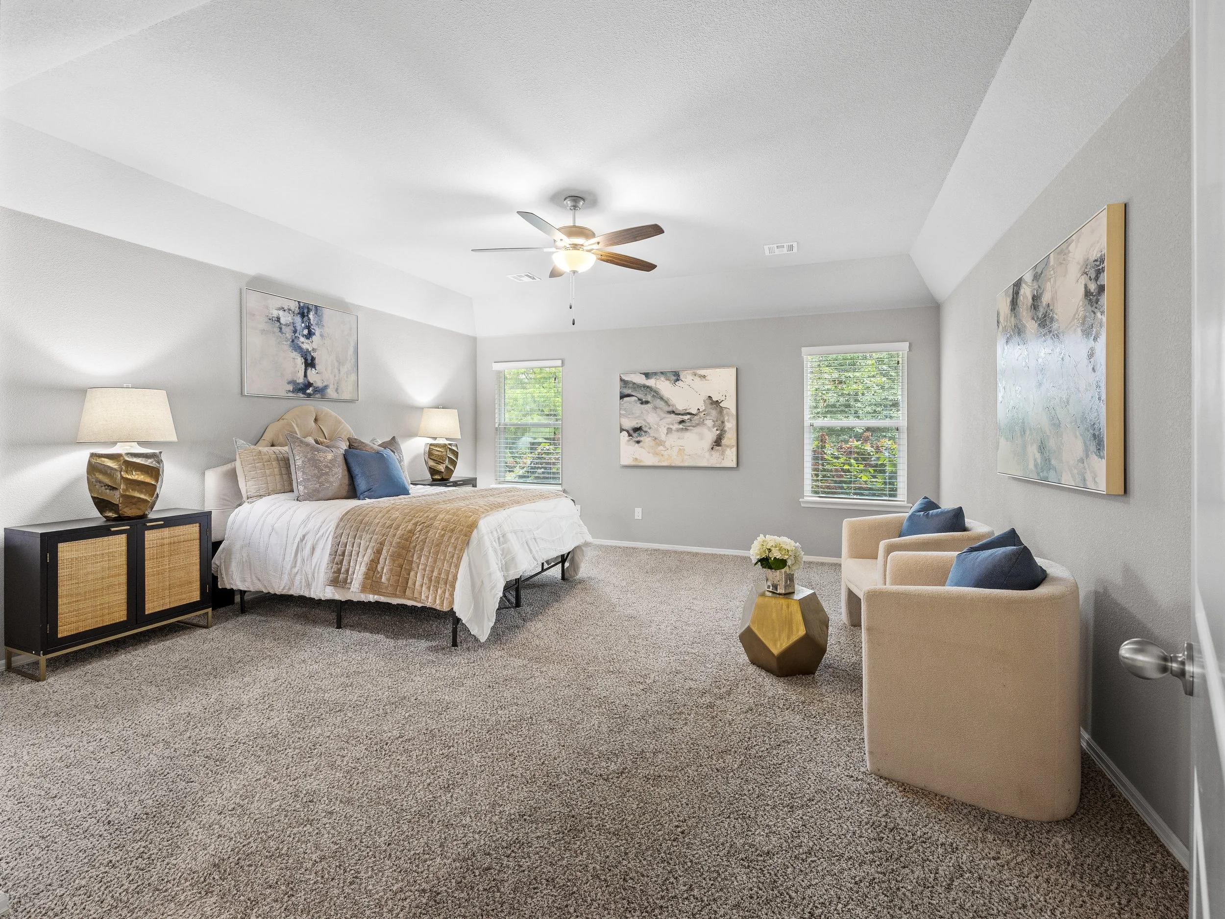 Spacious bedroom with a large bed, two bedside tables with lamps, and a sitting area with two armchairs and a small table with flowers. The room has light gray walls, three abstract paintings, two windows with blinds, and a ceiling fan.