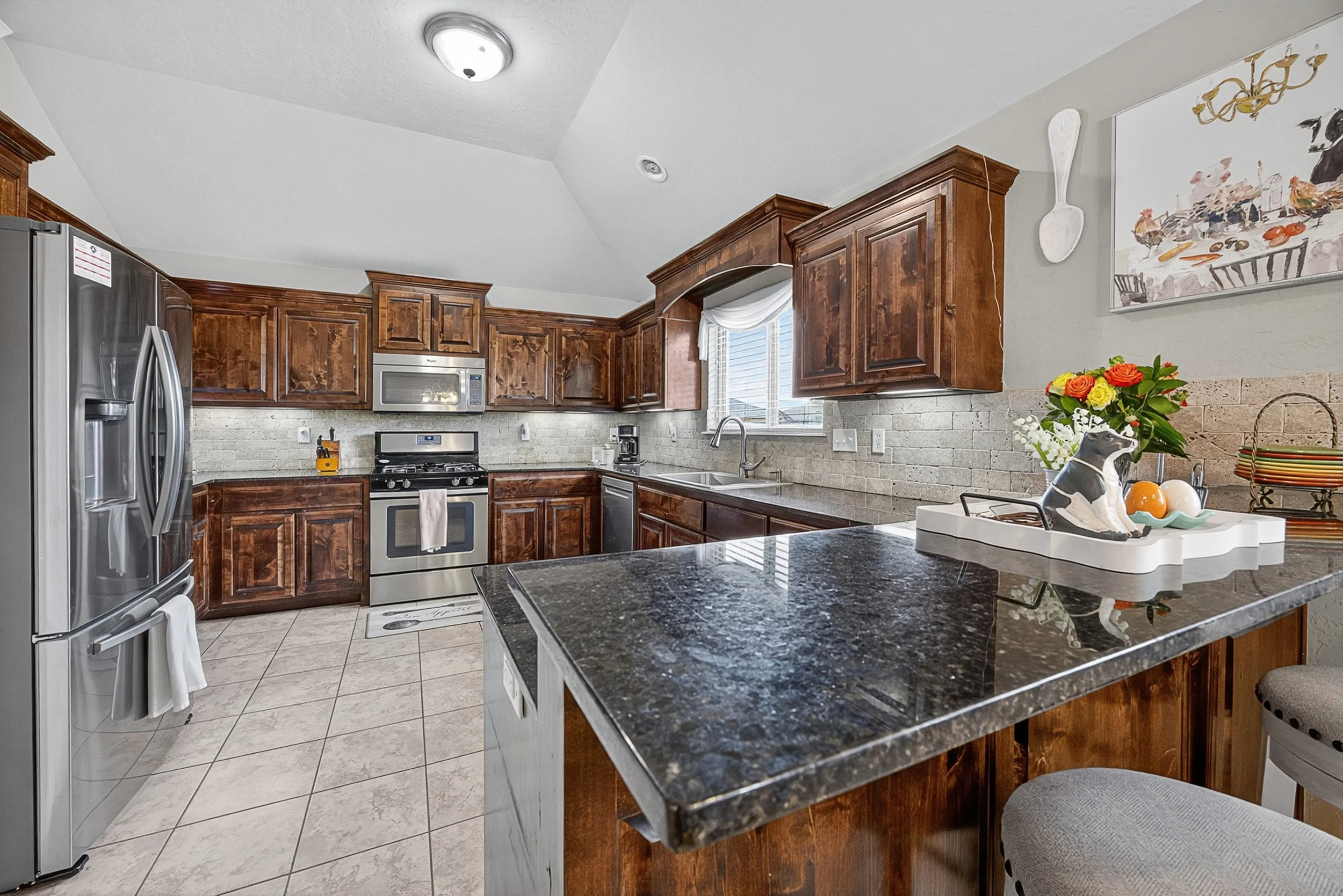 Kitchen with wooden cabinets, stainless steel refrigerator and appliances, granite island, tiled floor, and a window above the sink.