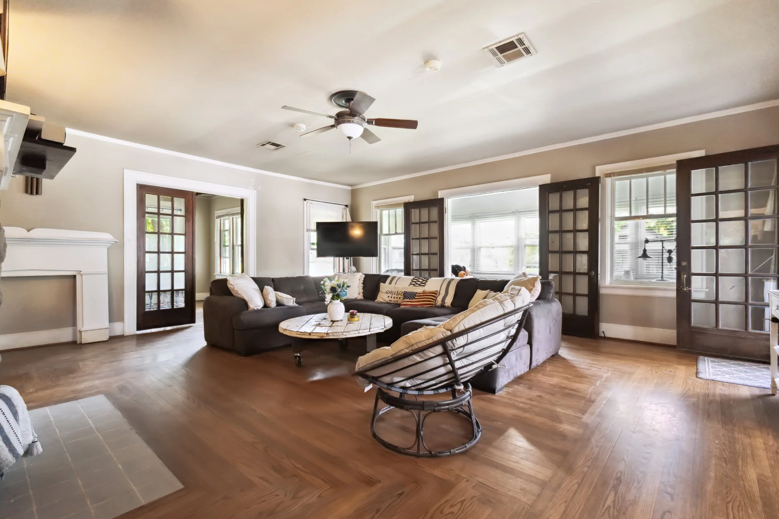 Living room with brown hardwood floors, a large gray sectional sofa, a round coffee table, and multiple windows with wooden framed glass doors, decorated in a cozy, modern style.