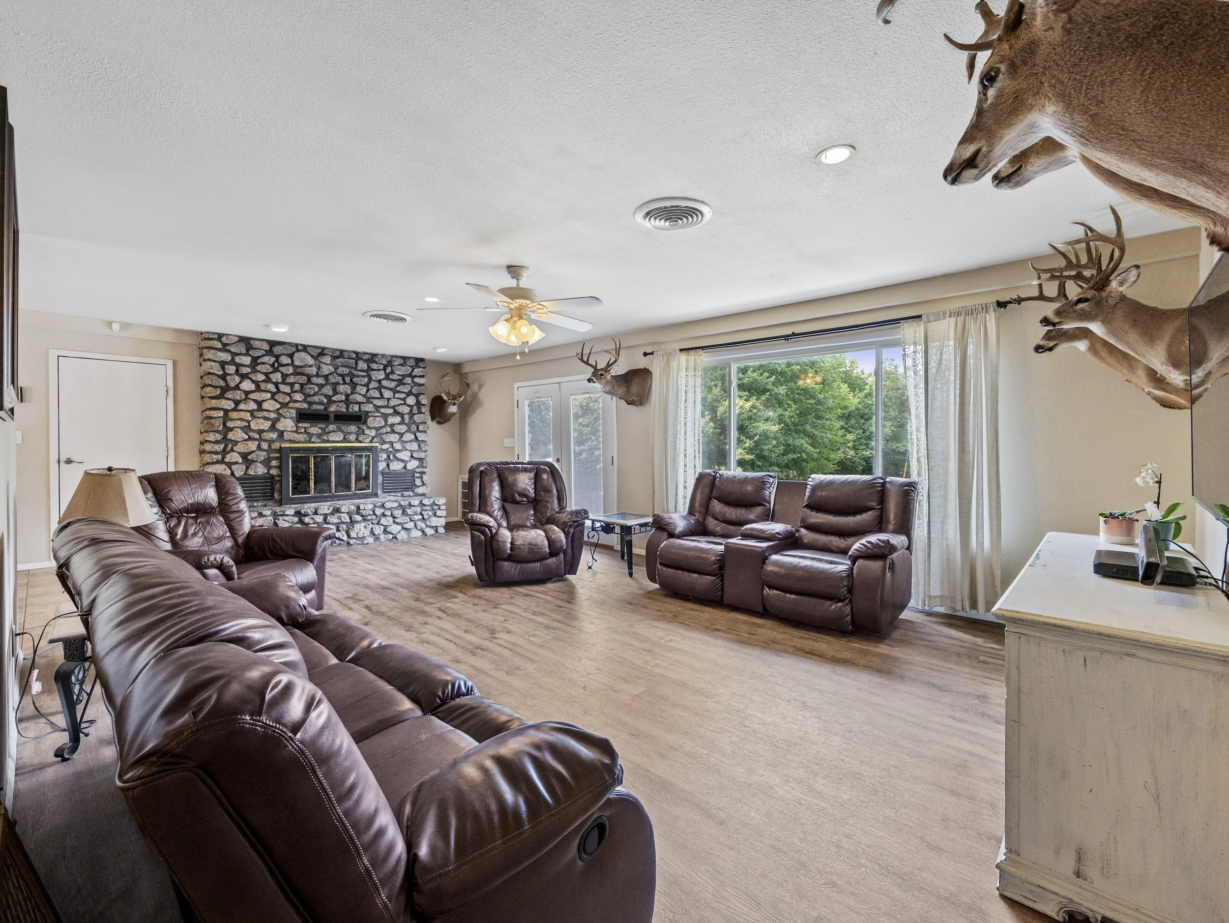Living room with leather recliner and sofa, stone fireplace, deer mounted heads, window with curtains, and a ceiling fan.