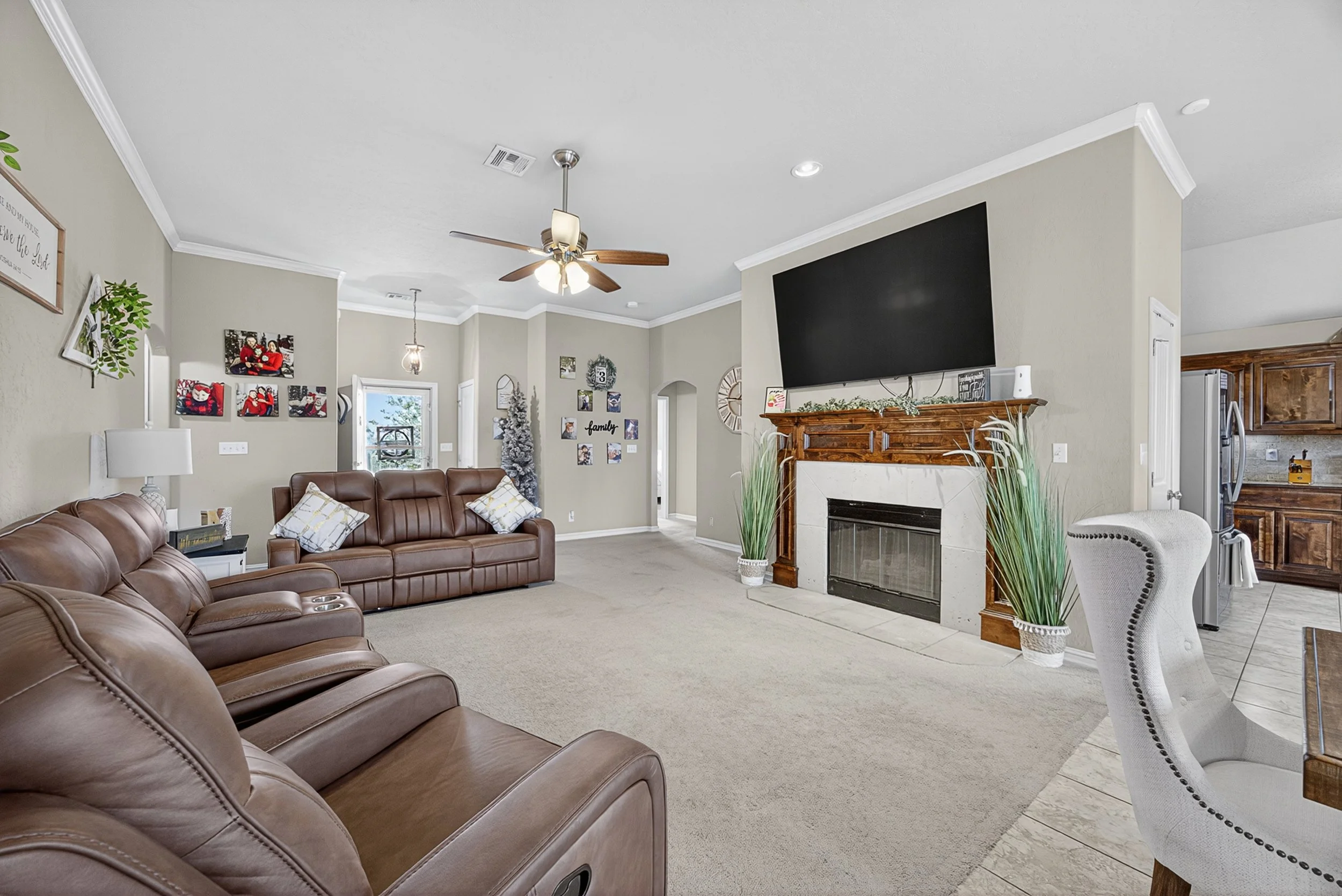 Living room with beige walls, leather sofas, a large flat-screen TV above a wooden fireplace mantel, and decorative plants.