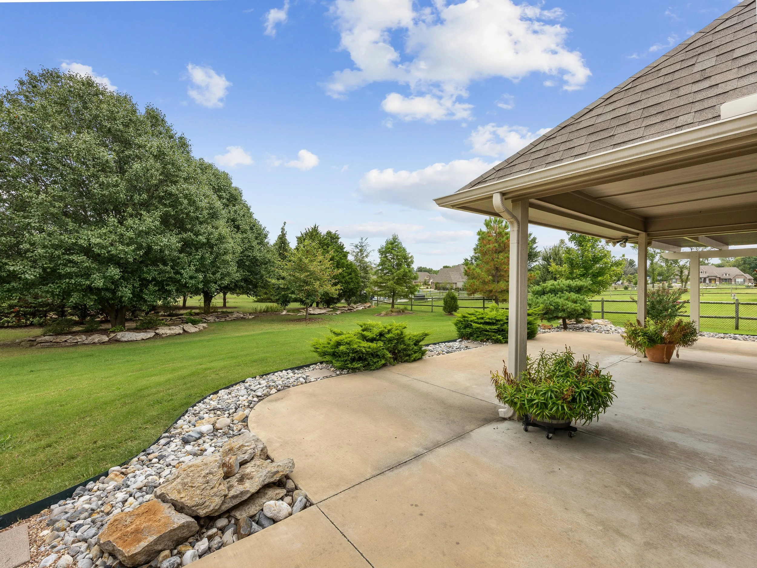 View of a backyard with a concrete patio, potted plants, green grass, trees, a wooden fence, and houses in the distance under a partly cloudy sky.