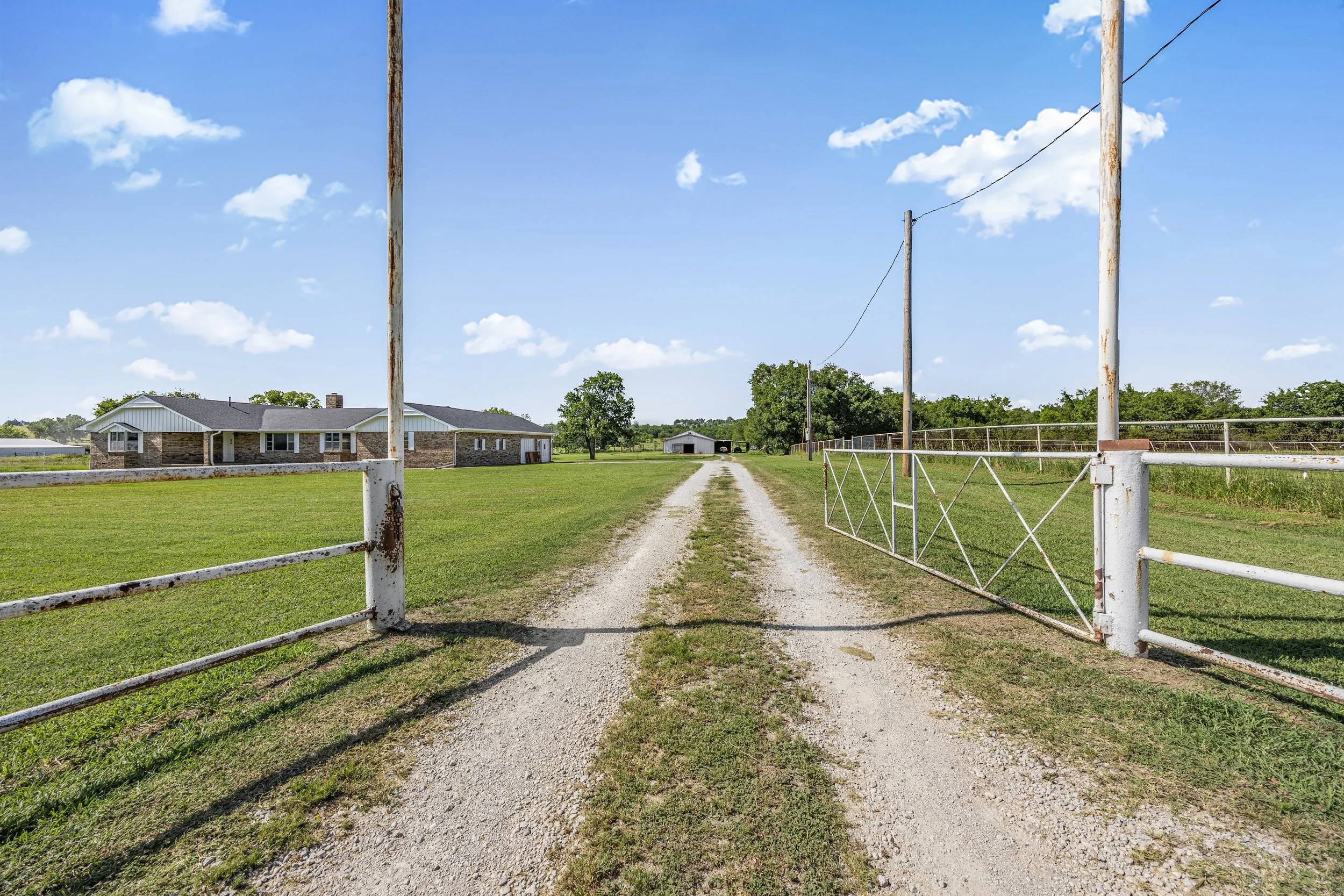 A dirt driveway on a farm leading to a house and outbuildings, with a metal gate and utility poles under a blue sky with clouds.