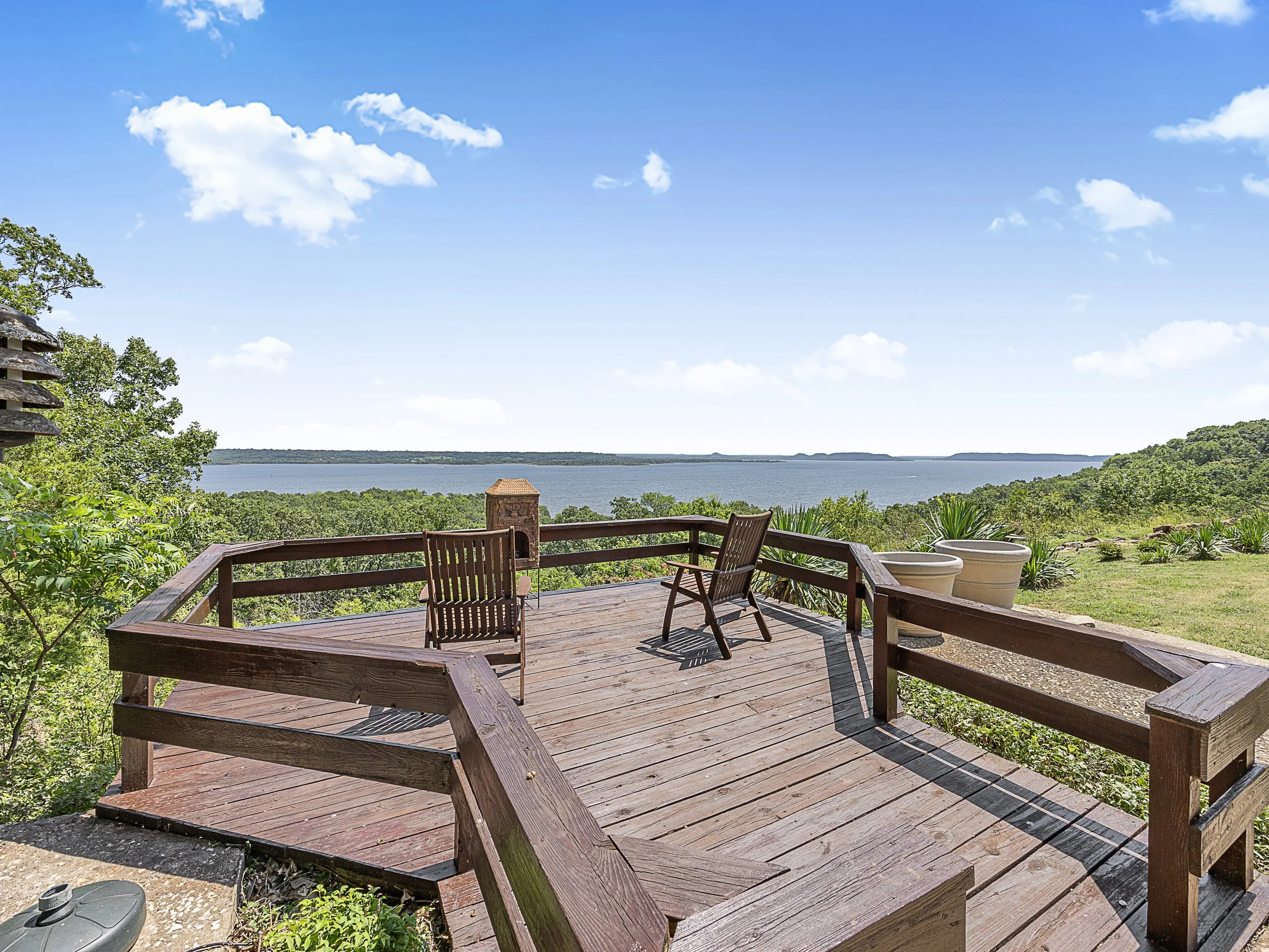 A wooden deck with two chairs and a view of a lake or river with green trees and a blue sky with clouds in the background.
