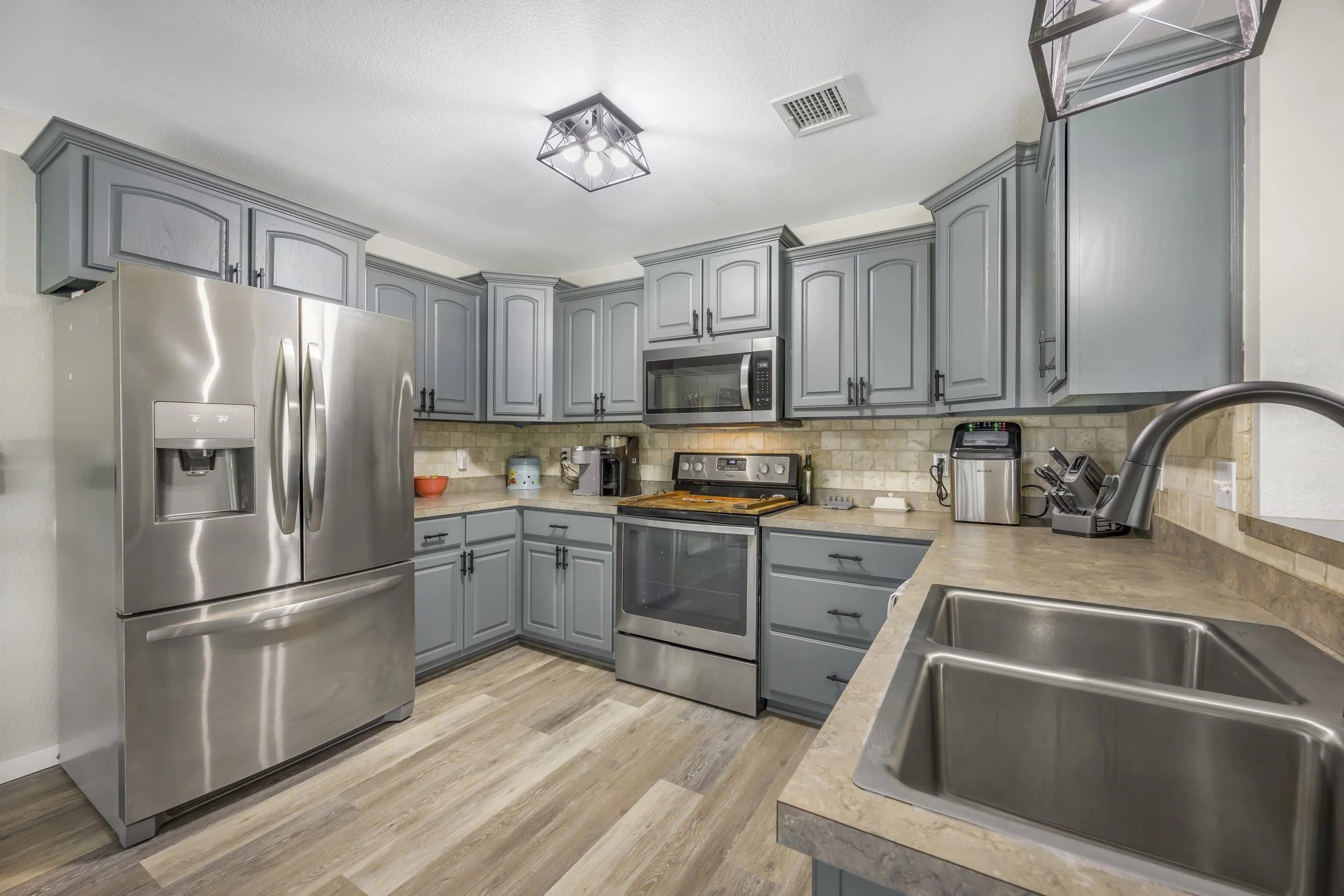 Modern kitchen with gray cabinetry, stainless steel refrigerator, oven, microwave, and sink, beige stone countertops, and wood-look flooring.