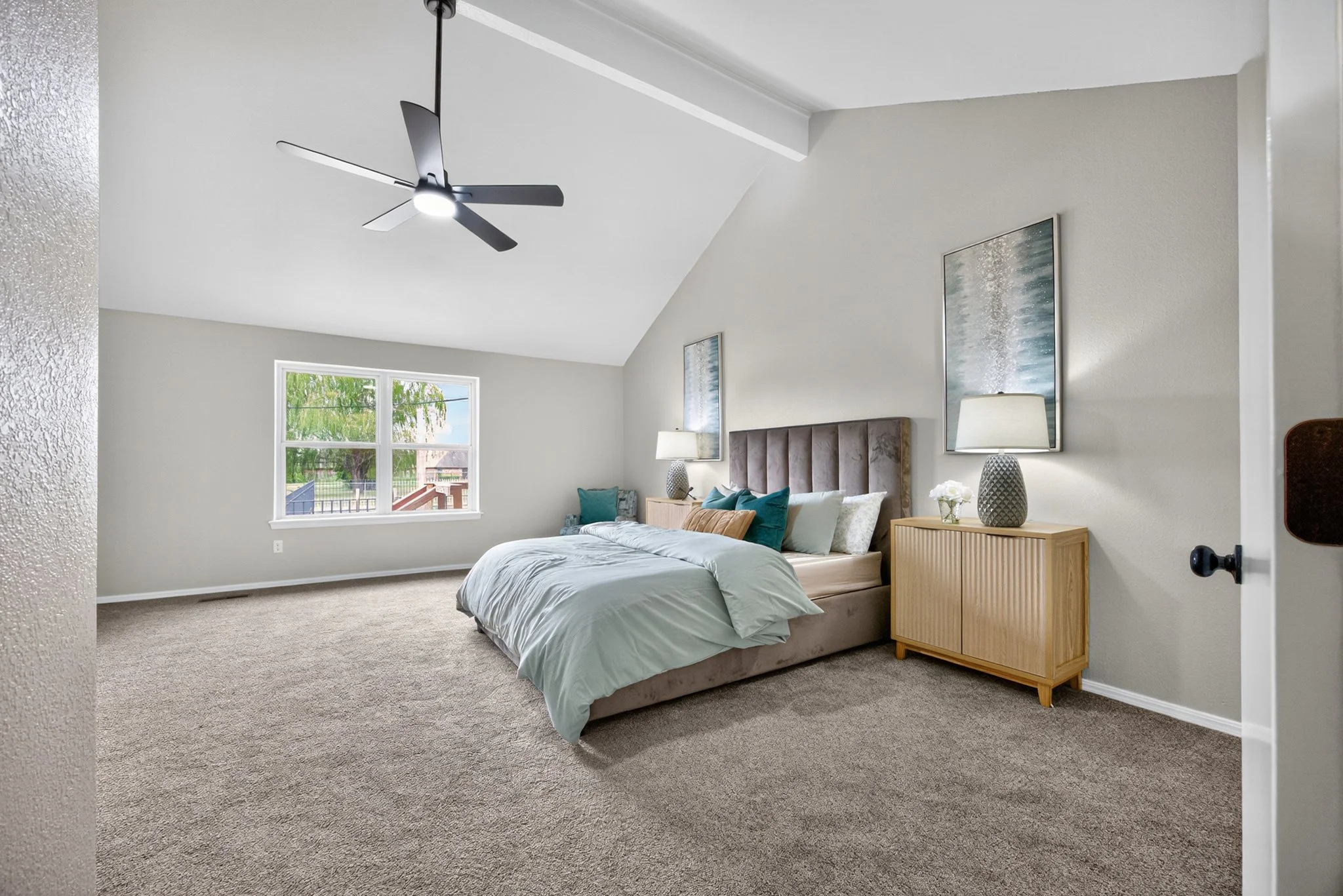 A bedroom with a white bed, blue pillows, two nightstands with lamps, framed artwork on the walls, a window with blinds, wooden trim, and a ceiling fan.